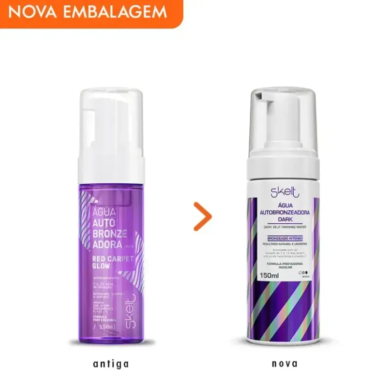 Indicada para todos os tipos de pele, a Água Autobronzeadora Skelt Dark possui fórmula com Ácido Hialurônico, Aloe Vera e agentes bronzeadores 100% naturais que, juntos, hidratam a pele e estimulam a produção de colágeno, além de promoverem um bronzeado com aspecto natural, saudável e uniforme, com durabilidade de 7 a 12 dias.