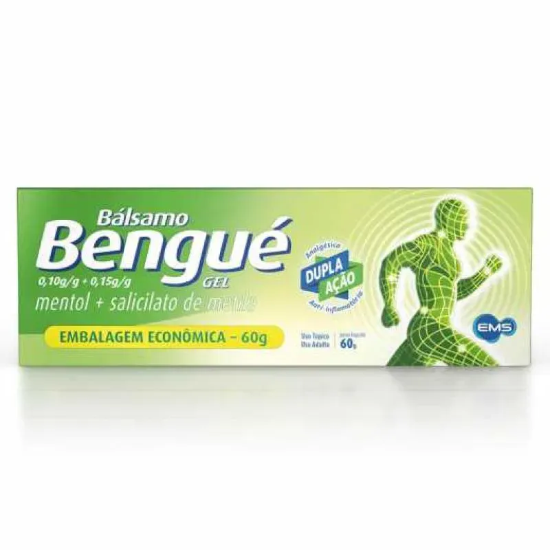 BÁLSAMO BENGUÉ GEL 60GBálsamo Bengué contém duas substâncias ativas: mentol e o salicilato de metila. O mentol, quando aplicado na pele, dilata os vasos sanguíneos, causando a sensação de frio e, em seguida, efeito analgésico. O salicilato de metila, quando aplicado na pele, tem ação irritante e rubefaciente (vermelhidão na pele), além das ações analgésica (alívio da dor) e anti-inflamatória características dos salicilatos.Bálsamo Bengué é indicado para o alívio do reumatismo (grupo de doenças que afeta as articulações, músculos e esqueleto), das nevralgias (dor aguda que pode atingir um ou mais nervos), do torcicolo, das contusões e alívio das dores musculares.USO: Agite bem antes de usar. Bálsamo Bengué solução tópica deve ser administrado em duas aplicações diárias sobre a região afetada. Evitar a aplicação em áreas muito grandes e a aplicação repetida. No momento de usar, evite inalação deste produto e proteja os olhos durante a aplicação. Suspenda o uso em caso de irritação ou reação alérgica. Não usar em pele ferida ou mucosa. Este medicamento deve ser utilizado apenas topicamente. Não faça curativo, não cubra, não enfaixe a área afetada. Se o fizer, pode aumentar o risco de efeitos colaterais. Siga corretamente o modo de usar. Em caso de dúvidas sobre este medicamento, procure orientação do farmacêutico. Não desaparecendo os sintomas, procure orientação de seu médico ou cirurgião-dentista.