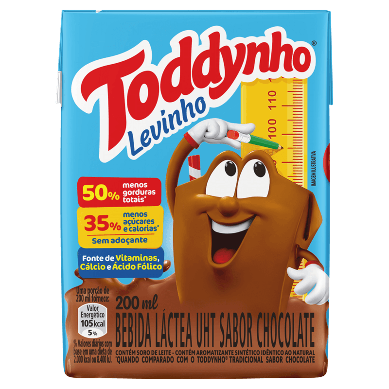 A aventura ficou mais leve e saborosa! A Bebida Láctea UHT Toddynho Levinho Chocolate 200ml mantém o sabor único e inconfundível do Toddynho, agora com fórmula melhorada: 35% menos açúcares, menos gordura e sem adição de adoçantes*. Fonte de cálcio e vitaminas A, C, D e ácido fólico, é a opção prática e nutritiva para lanches rápidos, merendas escolares ou momentos de diversão.