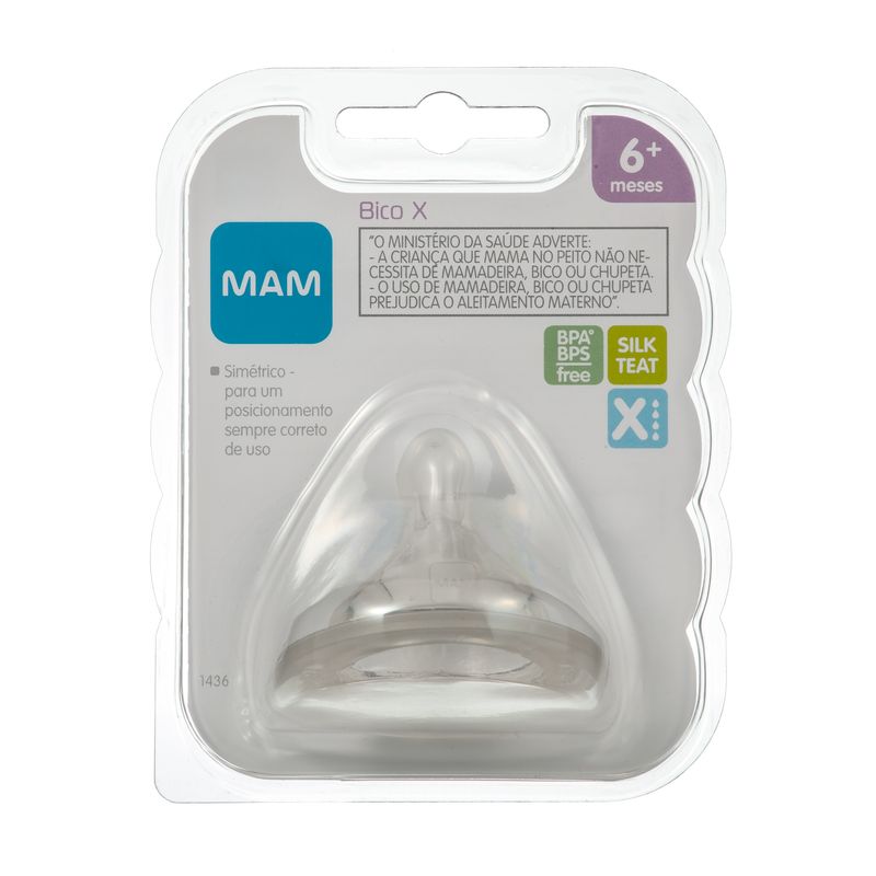 Bico X, fluxo super rápido, 1 unidade<br><br>Recomendado a partir de 6+ meses<br><br>Corte em formato de X recomendado para líquidos engrossados<br><br>Bico MAM com tecnologia SkinSoft*, textura macia e sedosa, comprovadamente aceita por 94% das crianças<br><br>Formato simétrico para um posicionamento sempre correto de uso<br><br>Válvula de ar estrategicamente localizada na lateral do bico para um fluxo regular<br><br>Os bicos MAM servem em todas as mamadeiras MAM e no copo Trainer+<br><br>CE-PUR/IQB 000153 NBR 13793/2012 ? OCP 006<br><br>SKINSOFT: Inovação da MAM: macio com superfície texturizada e sedosa.<br><br>VÁLVULA DE AR: Evita que o bico feche, trazendo um fluxo regular.<br><br>FORMATO SIMÉTRICO: Para um posicionamento sempre correto de uso.