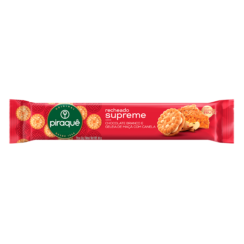 ConveniênciaBiscoitos e BatatasBiscoito Recheado Supremo Piraquê Chocolate Branco e Geleia de Maçã com Canela 80g
