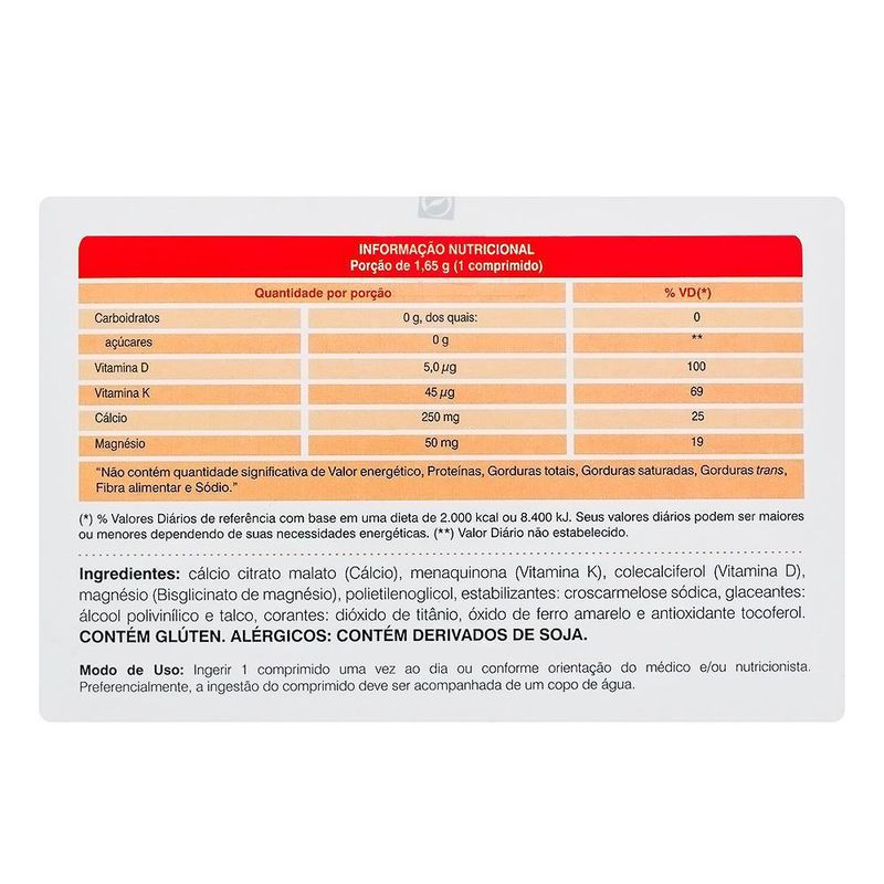 Cálcio (250mg), Vitamina D (Colecalciferol) (5mcg), Vitamina K (Menadiona) (45mcg), Magnésio (50mg).