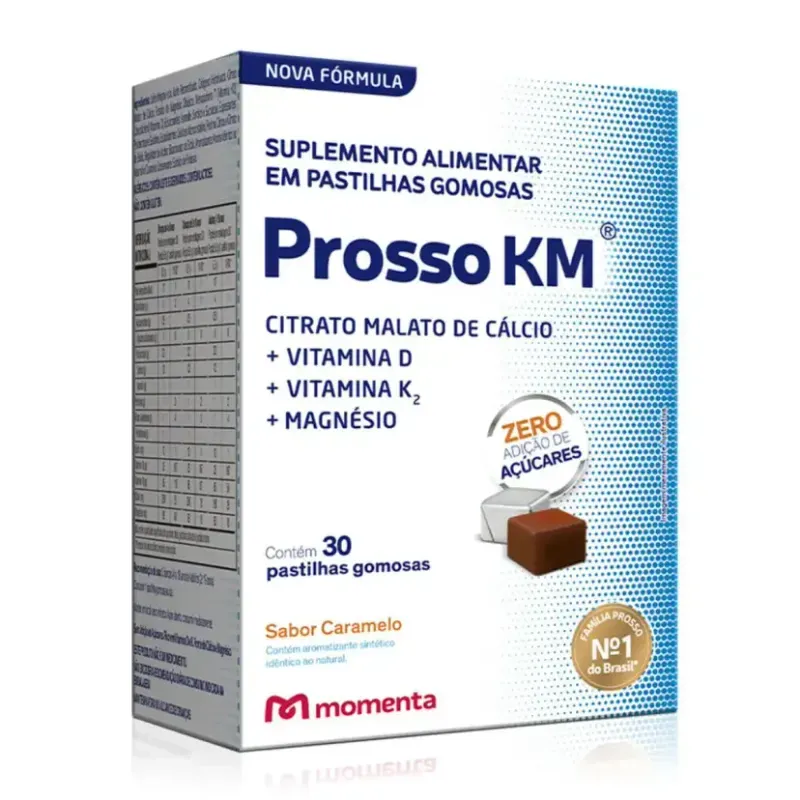 Prosso KM é um suplemento vitamínico e mineral desenvolvido para complementar as necessidades nutricionais diárias de Cálcio, Vitamina D3, Vitamina K2 e Magnésio, de homens e mulheres. Seu formato diferenciado de tabletes mastigáveis com sabor de caramelo facilita a ingestão desses nutrientes de forma prática e rápida.