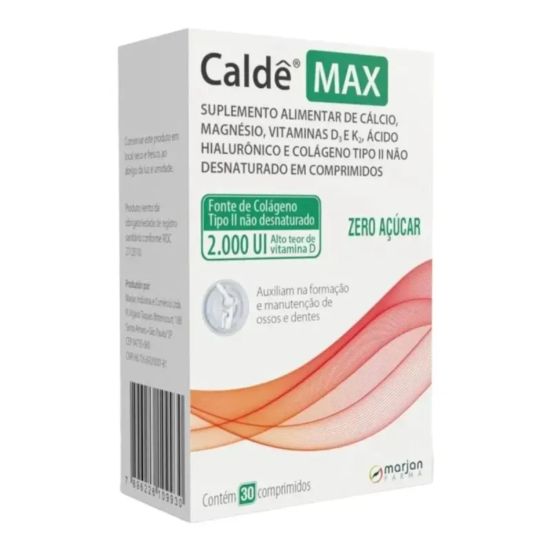 Caldê Max 60 Comprimidos Revestidos da Marjan é um suplemento alimentar completo, desenvolvido para contribuir com a saúde dos ossos, articulações e músculos. Sua fórmula combina Cálcio, Magnésio, Vitamina D3, Vitamina K2, Ácido Hialurônico, Vitamina E e Colágeno Tipo II, oferecendo suporte essencial para a formação e manutenção da estrutura óssea e da cartilagem.Ideal para adultos a partir de 19 anos, este suplemento auxilia na prevenção da osteoporose, melhora a absorção de cálcio e fósforo e favorece a lubrificação das articulações, proporcionando mais mobilidade e bem-estar no dia a dia.O produto vem em uma embalagem com 60 comprimidos revestidos, na versão sem sabor, o que facilita o consumo para quem prefere suplementos neutros. A dose recomendada é de 1 comprimido ao dia, com orientação de um profissional de saúde.Caldê Max é indicado para quem busca praticidade, qualidade nutricional e suporte completo à saúde osteoarticular em todas as fases da vida adulta.