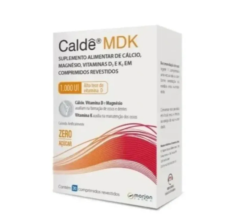 Caldê MDK é um suplemento vitamínico indicado para cuidar da saúde dos ossos. Ele foi desenvolvido para pessoas com deficiência de cálcio, vitamina K e vitamina D, ajudando na prevenção de fraturas e osteoporose.