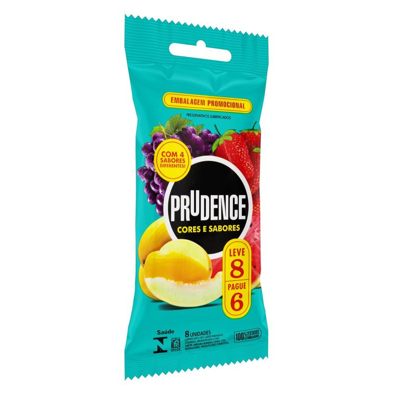 Prudence Cores e Sabores é uma linha de preservativos coloridos, lubrificados, aromatizados e com sabor. 100% testadas eletronicamente, estas camisinhas oferecem proteção para relações sexuais e está disponível em embalagem promocional com 8 unidades.