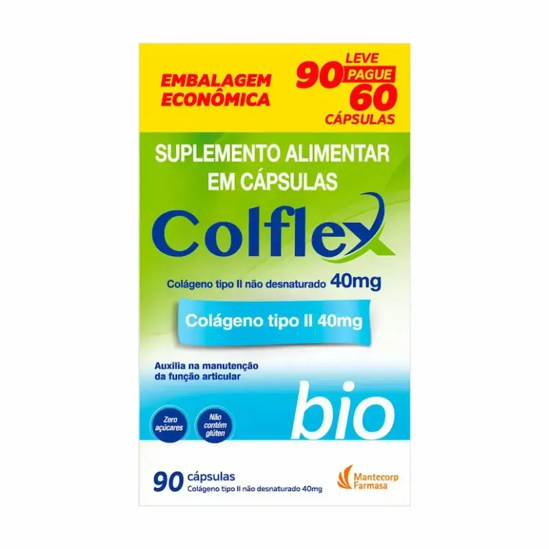 Colflex Bio é um suplemento alimentar feito de cápsulas de colágeno tipo II não hidrolisado. Praticamente puro, sem alteração molecular, este é um suplemento sem açúcares e sem glúten, disponível em embalagem econômica com 90 cápsulas (Leve 90, pague 60).
