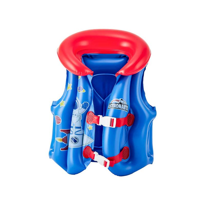 Com duas fivelas ajustáveis no cinto, ele oferece um ajuste personalizado e seguro, garantindo conforto e estabilidade na água. Sua estampa exclusiva e vibrante de astronauta estimula a imaginação, enquanto o design inflável proporciona a flutuação necessária para que os pequenos ganhem confiança e autonomia em um ambiente controlado.