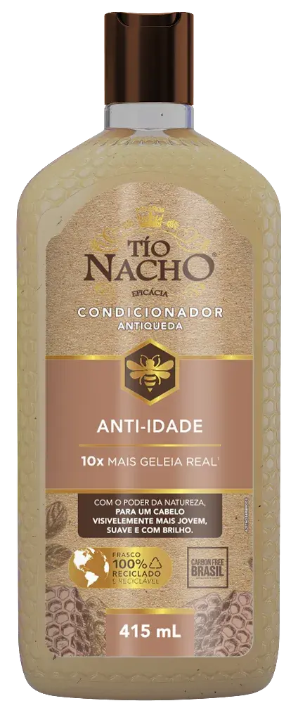 O condicionador Tío Nacho Anti-Idade é uma solução natural anti-idade que combina Geleia Real com extratos de origem natural e garante uma aparência mais jovem, forte e saudável aos cabelos. Sua fórmula conta com propriedades suavizantes que eliminam o excesso de oleosidade e oxigenam o couro cabeludo. Cabelos macios, volumosos, com força, brilho, hidratados e fáceis de pentear todos os dias.