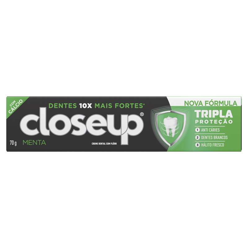 Creme Dental Closeup Triple Menta 70g possui uma fórmula com cálcio e flúor bioativo, que proporciona dentes fortes, mais brancos e hálito fresco. Sua fórmula promove uma limpeza profunda e eficaz, oferecendo um hálito fresco e duradouro.O flúor bioativo ajuda no combate às cáries, enquanto o cálcio auxilia no fortalecimento dos dentes. Além disso, Closeup Triple ajuda na remoção de manchas da superfície dos dentes, deixando-os mais brancos a cada escovação. O sabor de Triple Menta apresenta notas de menta, acrescentadas de uma combinação única de notas de anis e eucalipto, com um toque sutil de maçã. Aprecie o frescor do sabor de menta. Hálito fresco e dentes fortes e brancos para você ter confiança de chegar mais perto.