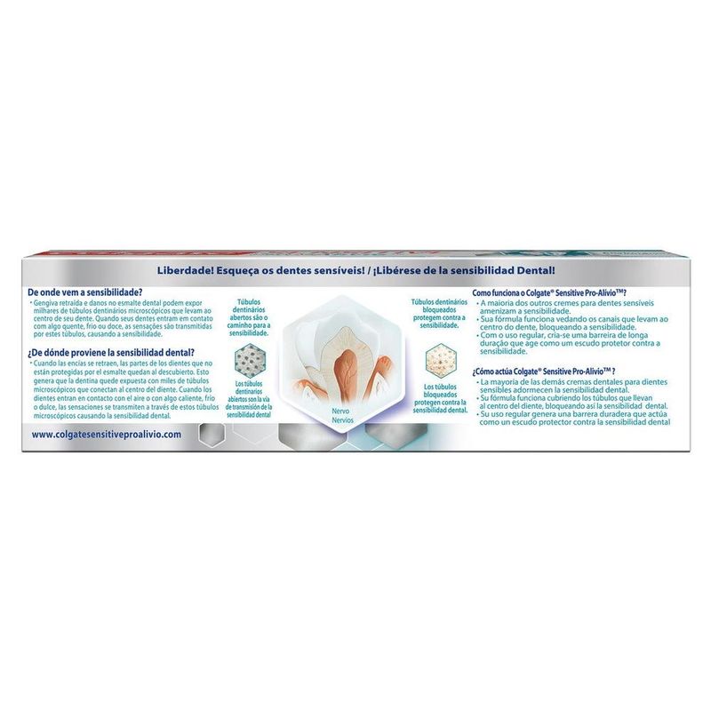 PASTA DE DENTE COLGATE SENSITIVE PRO-ALÍVIO 110GColgate Sensitive Pro-Alívio é uma pasta de dente desenvolvida para aliviar o incômodo causado por dentes sensíveis. Ela não só ameniza, mas bloqueia a sensibilidade, com sua fórmula que veda os canais que levam ao centro do dente. Com o uso regular e aplicação direta, massageando por 1 minuto em cada dente sensível, promove alívio instantâneo e duradouro da hipersensibilidade nos dentes.Colgate Sensitive Pro-Alívio conta com a tecnologia Pro-ArginTM, uma combinação de arginina com o carbonato de cálcio, que cria uma camada rica em cálcio na superfície do dente e em seu interior, selando-o e proporcionando alívio instantâneo e duradouro. Resultado clinicamente comprovado com o uso frequente.BenefíciosNão só ameniza, mas bloqueia a sensibilidade.Resultado instantâneo e duradouro.Clinicamente comprovado.Previne a cárie.Sabor menta.USO: Adultos e crianças maiores de 12 anosAplicar uma pequena quantidade (semelhante ao tamanho de uma ervilha) de Colgate Sensitive Pro-Alívio na escova de dente.Certificar-se de escovar todas as áreas sensíveis dos dentes.Escovar três vezes ao dia ou conforme a recomendação do seu dentista.Enxaguar após escovação.Crianças de 6 anos e menoresAplicar uma quantidade do tamanho de uma gota, supervisionado por um adulto para evitar ingestão.Crianças menores de 12 anos devem consultar um dentista.