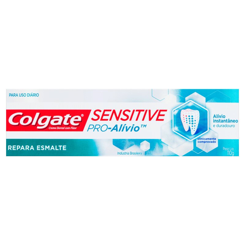 PASTA DE DENTE COLGATE SENSITIVE PRO-ALÍVIO REPARA ESMALTE 110GO Creme Dental Colgate Sensitive Pro-Alívio funciona vedando os canais que levam ao centro do dente.O Creme Dental Colgate Sensitive Pro-Alívio bloqueia a sensibilidade e remove efetivamente as manchas, para devolver o branco natural dos dentes. Com o uso regular, cria-se uma barreira de longa duração contra a sensibilidade dental.USO: Escovar todas as áreas sensíveis dos dentes. Escovar três vezes ao dia ou conforme a recomendação do seu dentista.