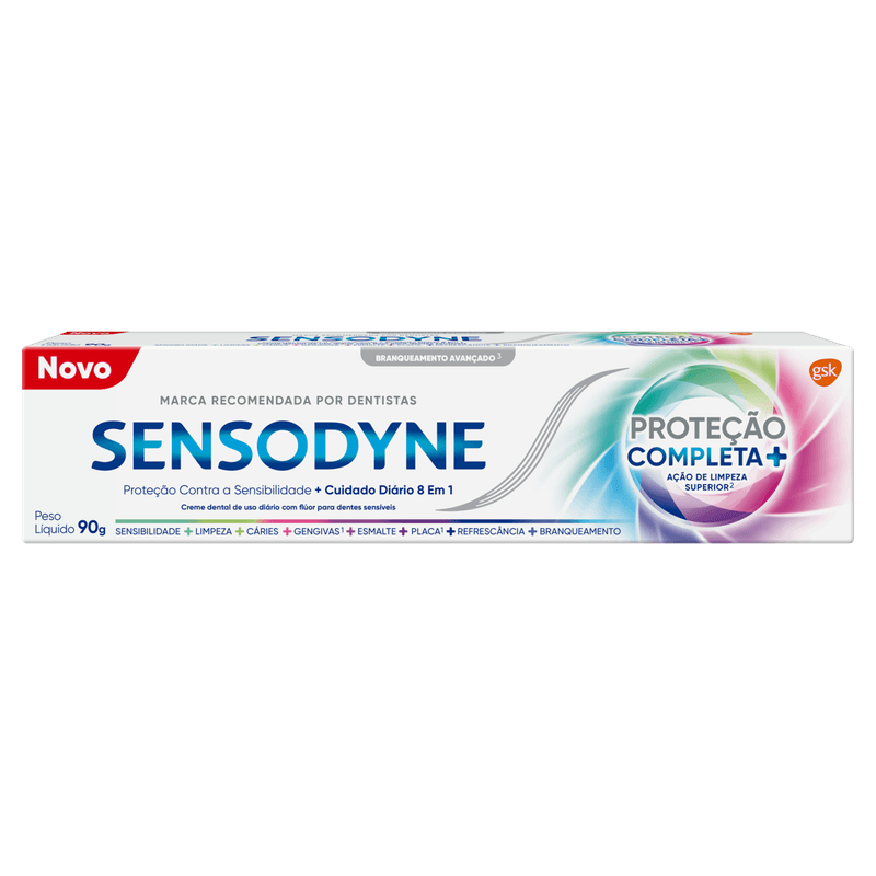 Pasta de Dente Sensodyne Proteção Completa 90gA pasta de dente Sensodyne Proteção Completa é um creme dental de uso diário que promove múltiplos benefícios para a saúde da boca. Clinicamente comprovada, ela protege contra sensibilidade dos dentes e garante um branqueamento avançado para ação clareadora superior.Recomendado por dentistas, Sensodyne Proteção Completa é o primeiro creme dental com sílica esférica, ideal para uma limpeza superior, que não agride os dentes mais sensíveis. Ele conta com sabor mentolado refrescante com toque de extratos naturais, para maior sensação de refrescância e limpeza.Benefícios e diferenciais da pasta de dente Sensodyne Proteção CompletaCreme dental de uso diário.Promove múltiplos benefícios para a saúde da boca.Protege contra a sensibilidade dos dentes.Clinicamente comprovado.Sabor mentolado refrescante com toque de extratos naturais.Branqueamento avançado para ação clareadora superior.Primeiro creme dental com sílica esférica.Ideal para uma limpeza superior, que não agride os dentes sensíveis.Sabor mais intenso que traz sensação de refrescância e limpeza.Cuidado diário 8 em 1.Marca recomendada por dentistas.Uso: Escove seus dentes duas vezes ao dia e não mais do que três, evitando engolir e expelindo o produto após a escovação.AdvertênciasSiga sempre as instruções da embalagem.Dentes sensíveis podem indicar um problema sério que exige a supervisão de um dentista.Não desaparecendo os sintomas durante as quatro primeiras semanas de uso, interrompa a utilização do produto e procure a orientação de um profissional.Como em outros produtos de uso oral, se houver alguma irritação, interrompa o uso.Evite a ingestão do produto.Não use em crianças menores de 12 anos a menos que recomendado pelo dentista ou médico.Converse com seu dentista ou médico assim que possível, se sentir inchaço na boca ou no rosto.Mantenha fora do alcance das crianças.