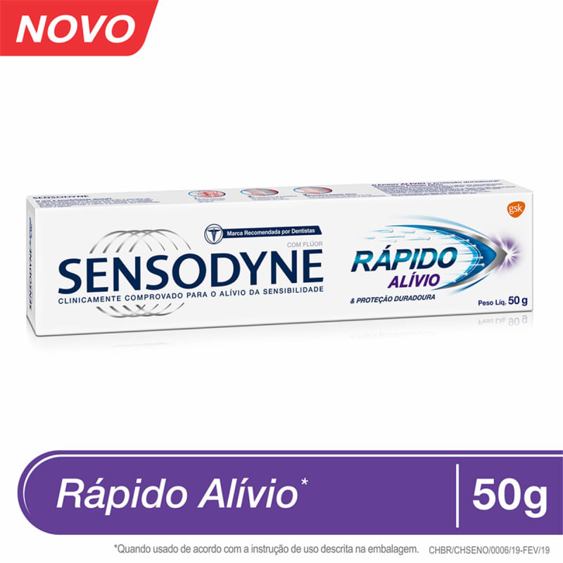 CREME DENTAL SENSODYNE RÁPIDO ALÍVIOB 50GO Creme Dental Sensodyne Rápido Alívio ajuda a promover alívio instantâneo e duradouro da sensibilidade nos dentes, com escovação diária duas vezes ao dia. Age em até 60 segundos ao massagear a base do dente com o creme dental, ajudando a controlar e prevenir a sensibilidade e gerando uma proteção que aumenta a cada escovação.