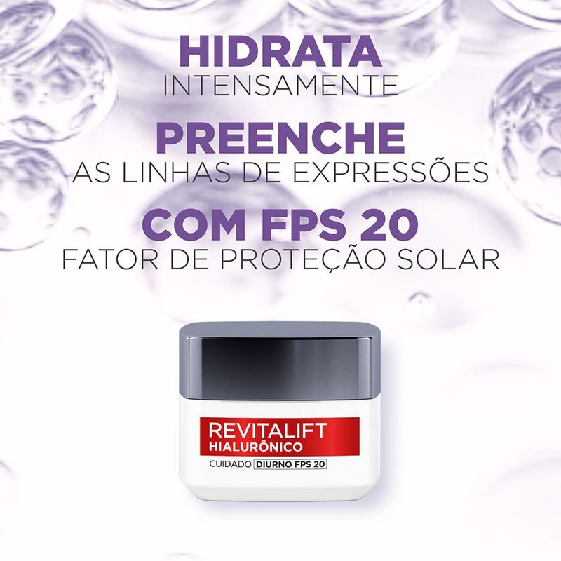 Ideal para iniciar sua rotina de skincare pela manhã, o Creme Revitalift Hialurônico Diurno da L'Oréal é um hidratante preenchedor facial com ação antirrugas. Além de combater os primeiros sinais do envelhecimento, ele hidrata intensamente por 24 horas, além de oferecer proteção FPS 20 e revitalizar a pele.