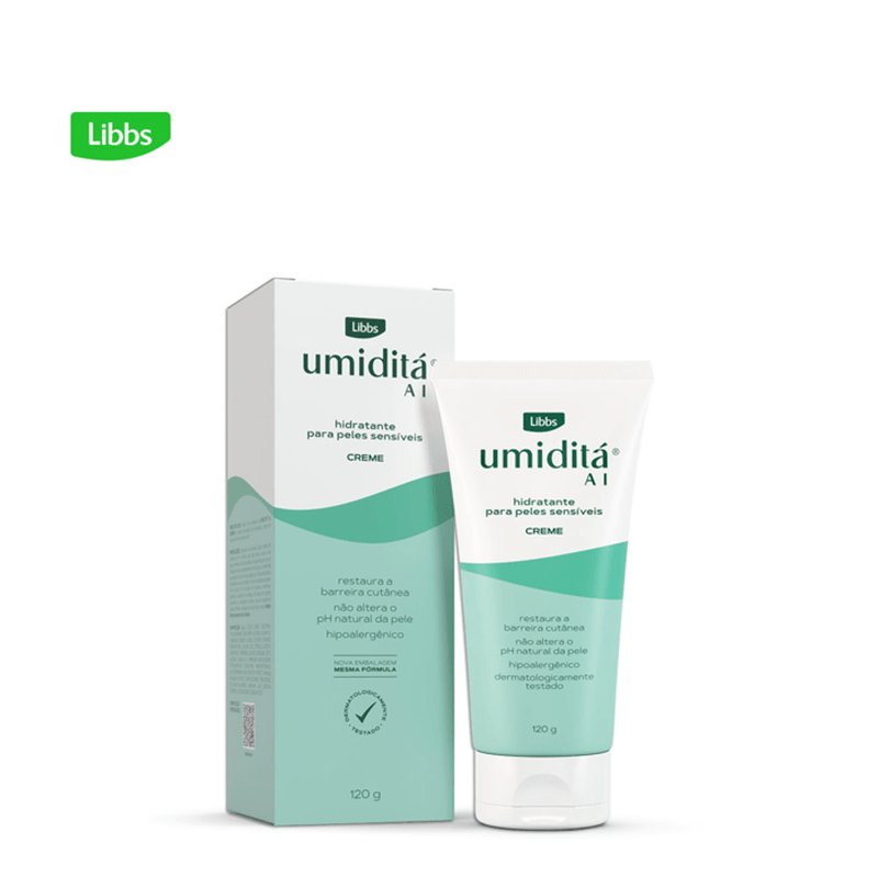 O Umiditá AI é um creme corporal hidratante de uso diário, que restaura a barreira cutânea, acalma e protege a pele.