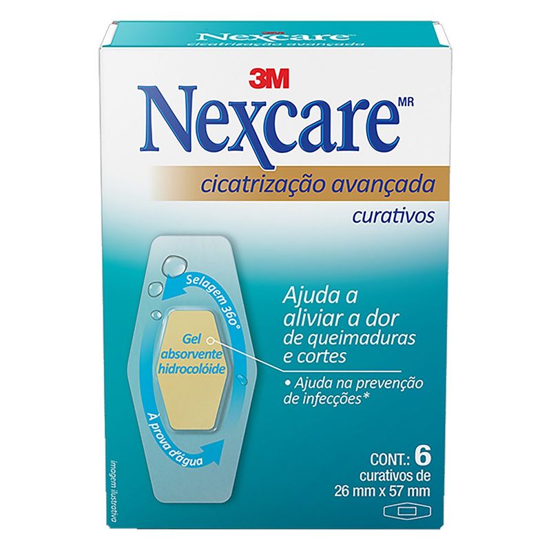 CURATIVO NEXCARE 3M CICATRIZAÇÃO AVANÇADA 6 UNIDADESO novo curativo cicatrização avançada ajuda na prevenção de infecções de cortes e queimaduras e no alívio da dor. Sua selagem 360° sela totalmente a ferida evitando a entrada de água, germes e sujeiras.   Com gel absorvente hidrocolóide, o curativo protege e trata. À medida que o gel entra em contato com sangue ou fluídos, ele absorve a secreção e fica branco, indicando o início da cicatrização.USO: Para aplicar o curativo, retire-o e aplique sob a pele. Acompanhe o progresso da sua ferida a cada quatro dias, e aplique um novo curativo se necessário.