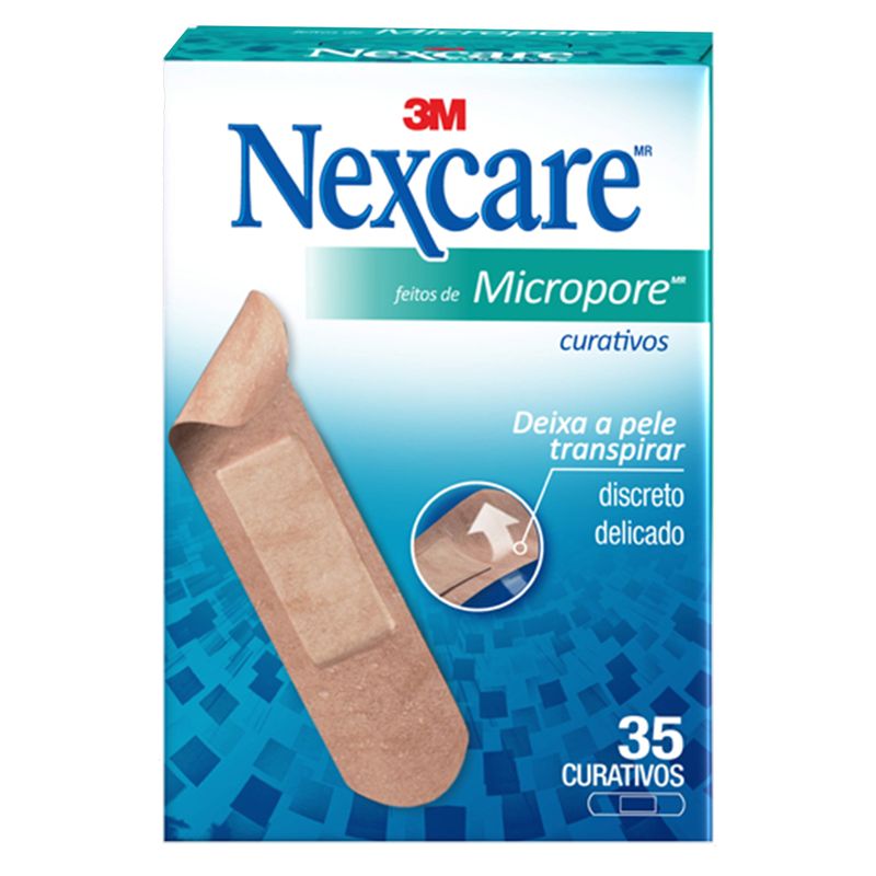 CURATIVO NEXCARE 3M MICROPORE - 35 UNIDADESO Curativo Feitos de Micropore Nexcare com almofadas que não aderem à ferida são discretos e desenvolvidos para cobrir e proteger pequenos ferimentos, promovendo o melhor ambiente para a cicatrização sem causar novos machucados. Com tecnologia Micropore®, permitem que a pele respire.Diferenciais- Possuem tecnologia Micropore, que permite que a pele respire.- Almofada que não adere a ferida.- Discretos.- Facil Remoção.- Almofada que não adere à ferida.Que o curativo não cause outra ferida! Os Curativos Feitos de Micropore Nexcare são desenvolvidos para cobrir e proteger pequenos ferimentos, promovendo o melhor ambiente para a cicatrização sem causar novos machucados.Essenciais para qualquer kit de primeiros socorros, os curativos 3M são perfeitos para o tratamento de pequenas feridas como cortes, arranhões, escoriações e bolhas. Além de discretos, os Curativos Feitos de Micropore Nexcare são confortáveis e feitos com tecnologia Micropore, que permite que a pele transpire.Ideais para peles sensíveis e frágeis e para uso prolongado, os curativos adesivos possuem almofada que não adere à ferida e são mais fáceis de serem removidos. Para aplicar o curativo Nexcare, retire-o e aplique sob a pele. Depois, remova o excesso. Acompanhe o progresso da sua ferida a cada quatro dias, e aplique um novo curativo se necessário.Aplicações sugeridasCobrem e protegem pequenos ferimentos como cortes, arranhões, escoriações e bolhasTipo de curativo ideal para peles sensíveis e frágeis e para curativos de uso prolongado