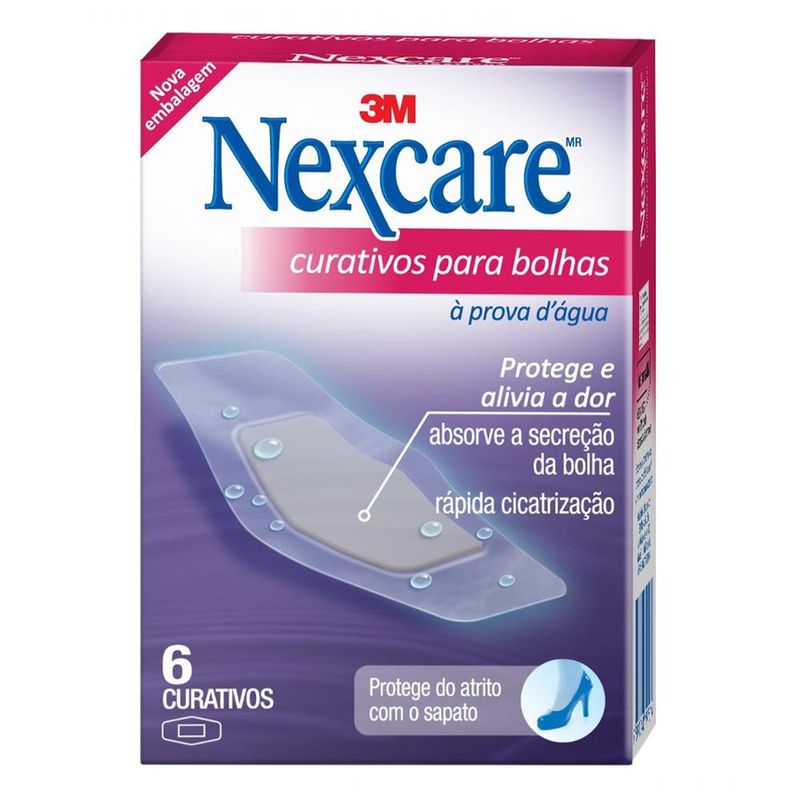 CURATIVO PARA BOLHAS NEXCARE 3M À PROVA D'ÁGUA 6 UNIDADESOs Curativos para Bolhas Nexcare são 100% à prova d’água e deixam a pele respirar, seu formato diferenciado impede a entrada de água, germes, sujeira e deixa a pele transpirar, sem causar novos machucados. Resistentes, protegem a região do atrito com o sapato. Fáceis de aplicar com tecnologia Nexcare para cuidado dos pés. Benefícios: - Feitos com gel hidrocolóide, absorvem a secreção da bolha, promovendo rápida cicatrização e aliviando a dor da região; - 100% à prova d’água e deixam a pele respirar; - Formato diferenciado que impede a entrada de água, germes e sujeira; - Resistentes, protegem a região do atrito com o sapato; - Super discretos e confortáveis; - Fáceis de aplicar; - Tecnologia Nexcare para cuidado dos pés.
