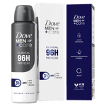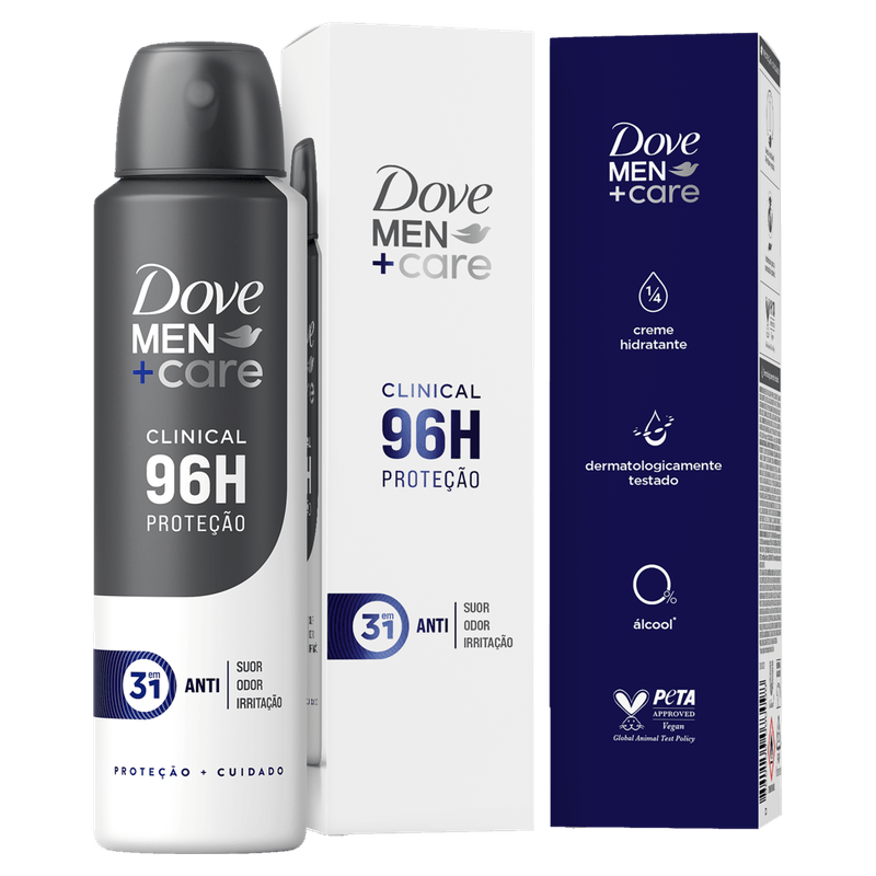 Dove Men+Care Clinical Cuidado Total é um desodorante antitranspirante com fórmula avançada composta por 1/4 de tecnologia hidratante, que cuida da pele das axilas contra irritações, enquanto oferece 3 vezes mais proteção contra o suor do que um antitranspirante básico. Ainda, conta com 96 horas de máxima proteção contra suor e mau odor, é livre de álcool e possui fragrância exclusiva.