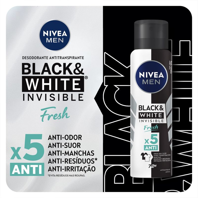 DESODORANTE ANTITRANSPIRANTE AEROSOL NIVEA MEN BLACK&WHITE INVISIBLE FRESH 150MLO Nivea Men Black&White Invisible Fresh é um desodorante antitranspirante com tecnologia que previne manchas brancas e amareladas, causadas pela transpiração, em roupas pretas e brancas.Indicado para homens que necessitam de um antitranspirante que mantém as axilas secas e sem ressecamento, o Nivea Men possui fórmula com ação antibacteriana que elimina até 99,99% das bactérias e protege por até 48 horas contra o suor, mau odor e o surgimento de manchas.USO: Agite antes de usar e aplique com uma distância de 15cm das axilas.Espere secar antes de vestir a roupa.Em caso de funcionamento anormal da válvula, vire o frasco para baixo e agite bem.Benefícios e diferenciaisTripla proteção: Antitranspirante, Antimanchas e Antibacteriana.Previne manchas brancas nas roupas pretas e manchas amareladas nas roupas brancas.Oferece 48 horas de proteção contra suor e mau odor.Prolonga a sensação de banho tomado o dia todo.0% de álcool etílico e corantes.AdvertênciasUsar somente nas axilas.Não usar se a pele estiver irritada ou lesionada.Caso ocorra irritação e/ou prurido no local da aplicação, suspender o uso imediatamente e procurar orientação médica.Evite a inalação deste produto.Proteja os olhos durante a aplicação.Perigo: Aerossol extremamente inflamável.Recipiente sob pressão: risco de explosão sob a ação do calor.Mantenha afastado do calor, superfícies quentes, faísca, chama aberta e outras fontes de ignição. Não fumar. Não pulverizar perto do fogo ou outra fonte de combustão.Não perfurar, nem incinerar, nem queimar, mesmo após utilização.Não expor ao sol, nem a temperaturas superiores a 50ºC.Somente a embalagem vazia pode ser reciclada.Caso haja contato com os olhos, lave-os abundantemente.Conserve em local seco, fresco e ao abrigo de luz intensa.Mantenha fora do alcance das crianças.