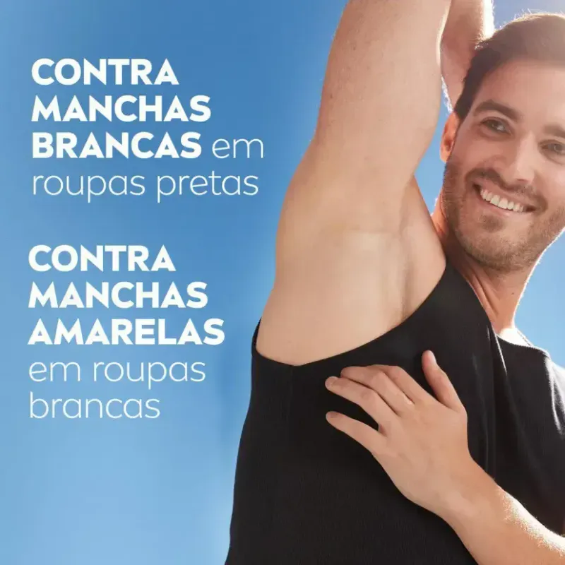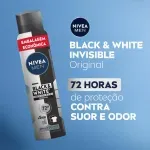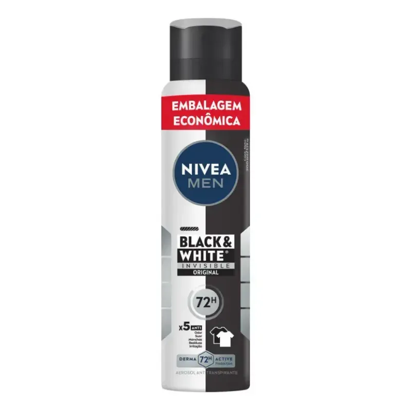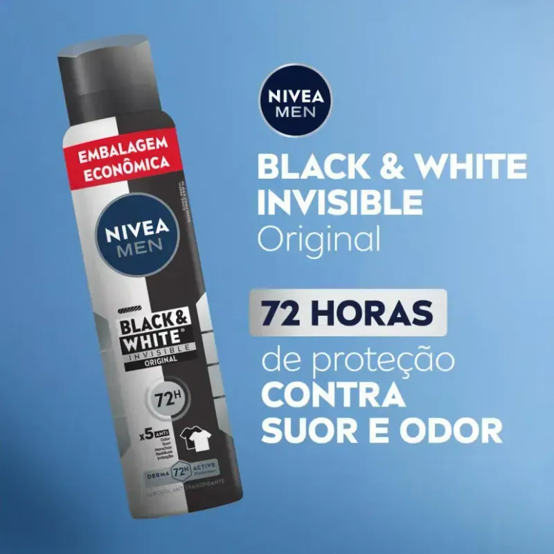 Nivea Men Black&White é um desodorante em aerossol que, além de oferecer proteção antitranspirante por até 48 horas, possui uma fórmula poderosa antibacteriana - eliminando 99,99% das bactérias causadoras do mau odor - e uma tecnologia inovadora que protege as fibras dos tecidos. Ele evita manchas brancas nas roupas e o surgimento de manchas amarelas.