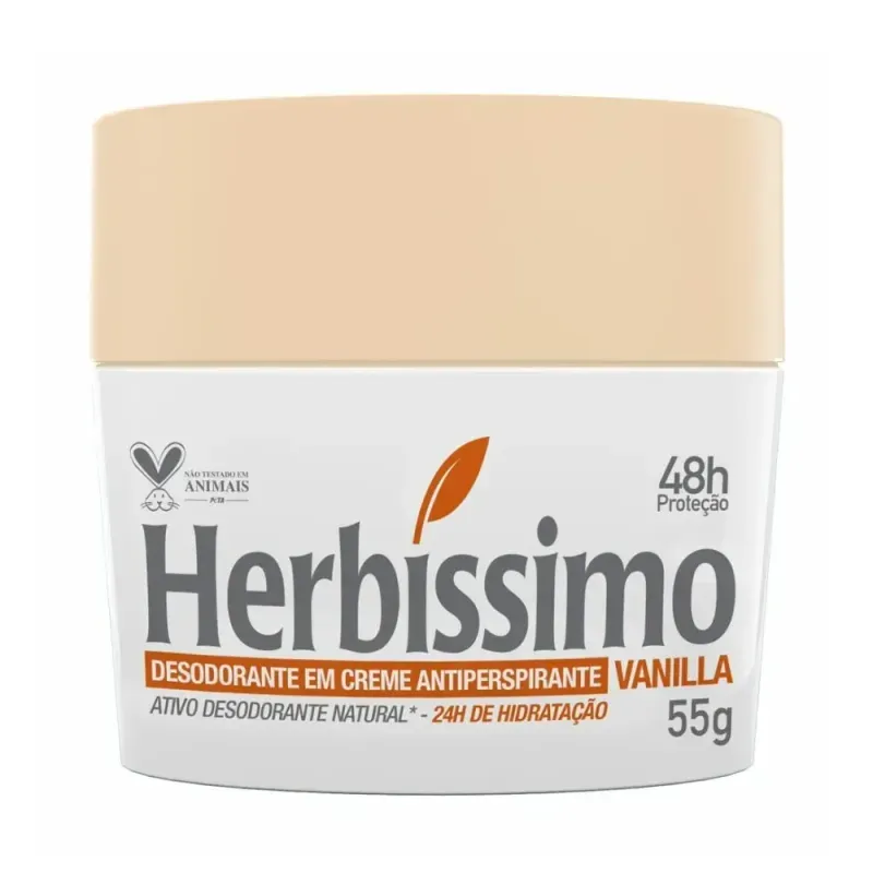 Desodorante Herbisimo Creme 55gr VANILLA O Desodorante Herbíssimo Creme Vanilla oferece proteção a pele das axilas do suor e mau odor por até 48 horas. Sua fórmulação contém glicerina vegetal e óleo de girassol com ação hidratante por até 24h, lubrificante e nutrição auxiliando em processos de cicatrização da pele, previnindo irritações e manchas na pele delicada das axilas. É dermatologicamente testado. Não contém álcool e corantes