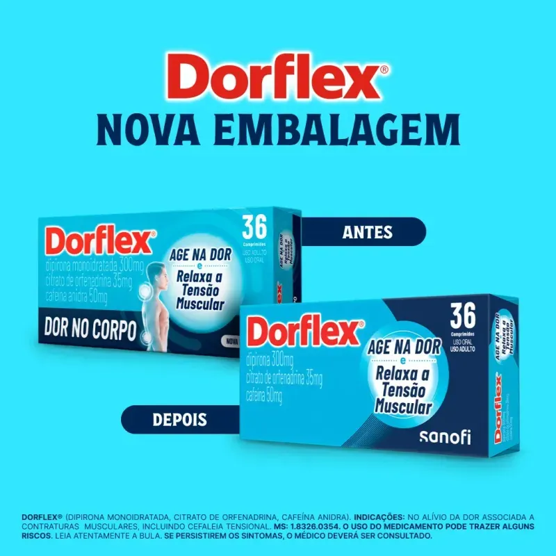 Para que serve o Dorflex?Dorflex é indicado no alívio da dor associada a contraturas musculares, incluindo dor de cabeça tensional. As causas mais comuns para as dores musculares variam entre má postura, sobrecarga, dores após exercícios físicos, contraturas musculares e até mesmo estresse. Dorflex® age na dor, relaxa a tensão muscular e seu efeito dura por horas.Agindo em até 30 minutos após a ingestão, Dorflex contém em sua composição 300 mg de Dipirona monoidratada (com função analgésica), 35 mg de Citrato de orfenadrina (relaxante muscular) e 50 mg de Cafeína anidra (que potencializa o efeito analgésico). É recomendado para o alívio de dores associadas a contraturas musculares – sendo considerado o analgésico nº 1 do Brasil – e está disponível em cartelas de 10 e em caixas de 24, 36 e 50 comprimidos.Como usar o Dorflex?Você deve tomar os comprimidos com líquido (aproximadamente ½ a 1 copo), por via oral.Posologia1 a 2 comprimidos, 3 a 4 vezes ao dia. Não ultrapassar estes limites.Não há estudos dos efeitos de Dorflex administrado por vias não recomendadas. Portanto, por segurança e para eficácia deste medicamento, a administração deve ser somente pela via oral.Siga corretamente o modo de usar. Em caso de dúvidas sobre este medicamento, procure orientação do farmacêutico. Se os sintomas persistirem, procure orientação de seu médico ou cirurgião-dentista.Este medicamento não deve ser mastigado.Quando não devo usar o Dorflex?Dorflex não deve ser utilizado nos seguintes casos:- Alergia ou intolerância a qualquer um dos componentes da fórmula ou a analgésicos semelhantes à dipirona – derivados de pirazolonas (ex.: fenilbutazona, oxifembutazona) ou de pirazolidinas – incluindo, por exemplo, casos anteriores de agranulocitose (redução acentuada na contagem de leucócitos);