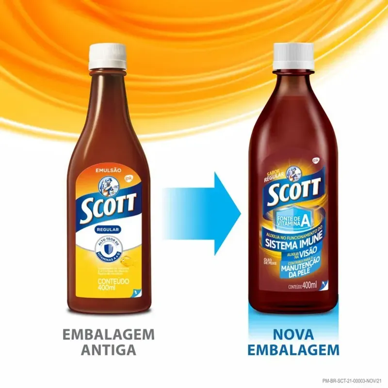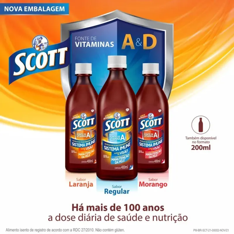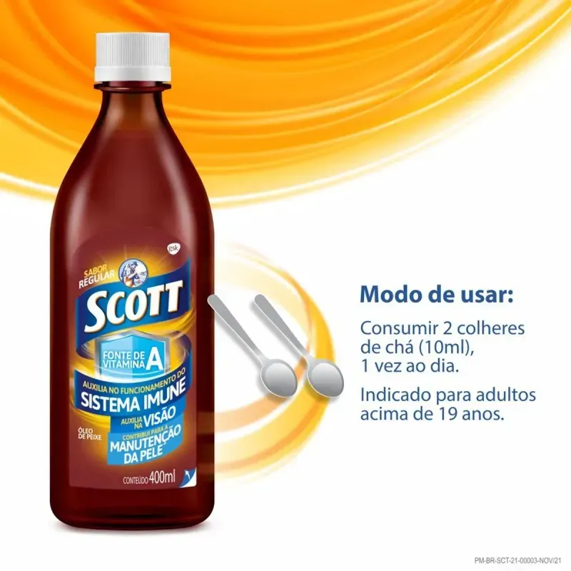 O Scott é um suplemento alimentar à base de óleo de fígado de bacalhau, indicado para adultos acima de 19 anos. Além disso, sua formulação é rica em vitamina A e D, que auxiliam diretamente no bom funcionamento da visão e do sistema imunológico.