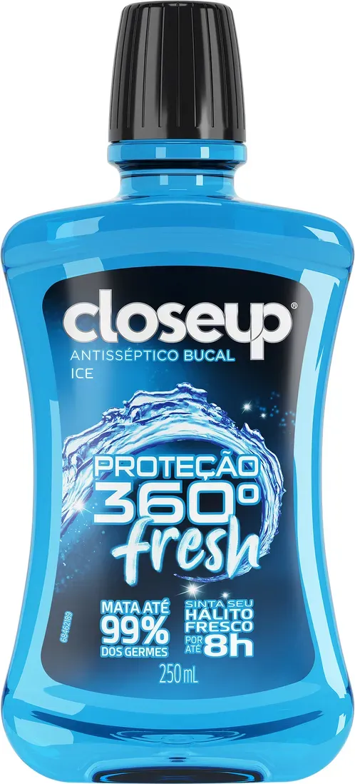 Closeup Ice Proteção 360° Fresh é um enxaguante bucal com ação antisséptica, que ajuda a impedir a formação da placa bacteriana e das cáries. Promete matar até 99% dos germes na boca e proporcionar um hálito fresco por até 8 horas.