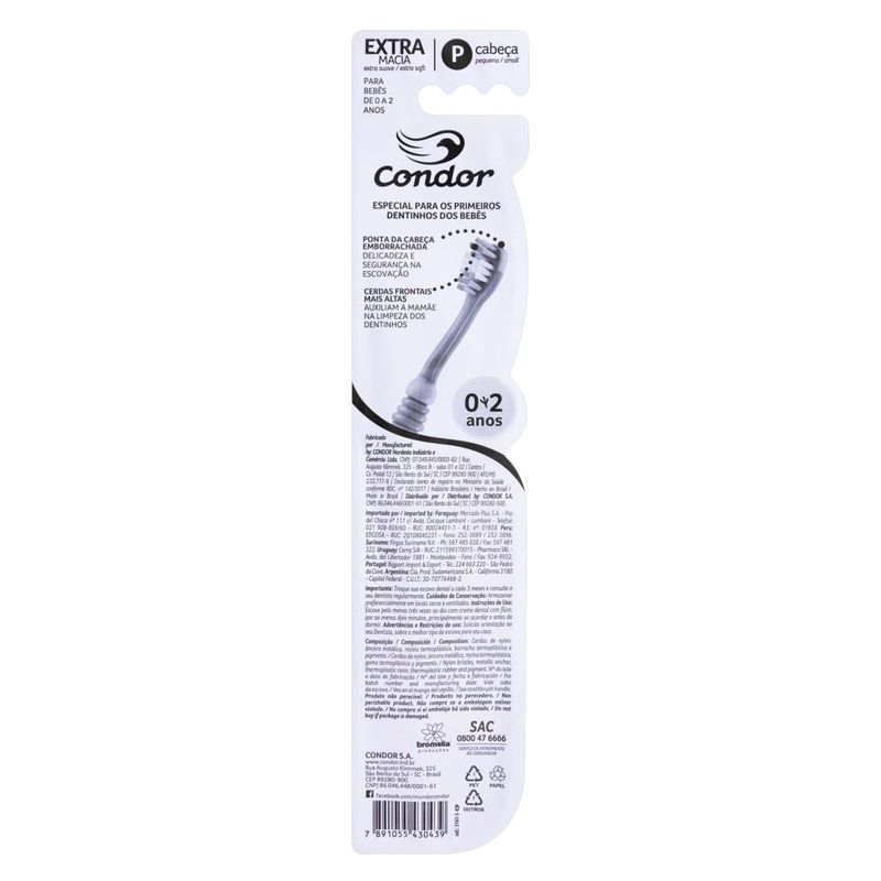 A escova baby condor galinha pintadinha foi projetada especialmente para os primeiros dentinhos dos bebês. 0 a 2 anos