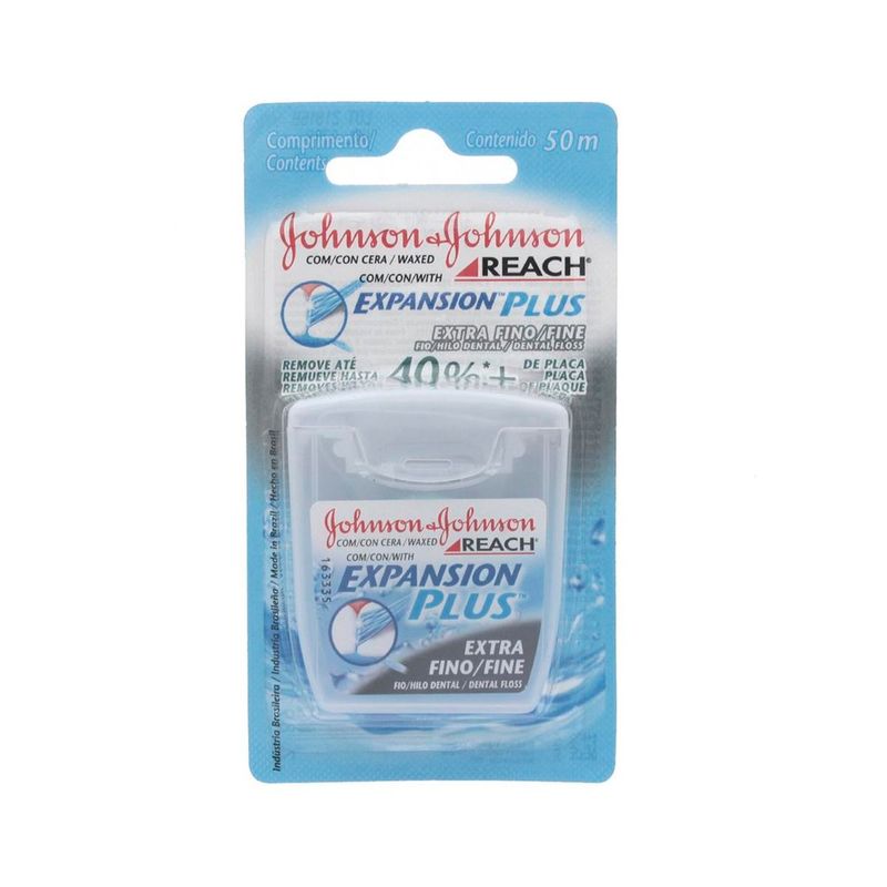 FIO DENTAL JOHNSON E JOHNSON REACH EXTRA FINO 50 METROSFio Dental Johnson's Reach Expansion Plus Menta possui tecnologia Expansion Plus, que promove a expansão do fio ao entrar em contato com a superfície do dentes, removendo até 40% a mais da placa bacteriana. Possui sabor de menta mais acentuado para prolongar a sensação de hálito fresco.USO: O fio dental Johnson & Johnson Reach foi desenvolvido para auxiliar na manutenção da saúde dos dentes, pois ajuda na remoção da placa bacteriana que a escova não alcança.
