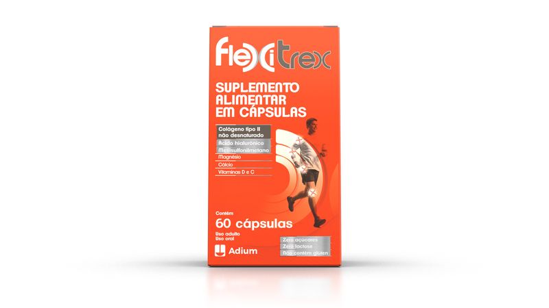 Flexitrex é um suplemento alimentar em cápsulas com Colágeno Tipo II não hidrolisado + HA + MSM + Magnésio + Vitaminas C e D + Cálcio. Sem efeitos colaterais e interações medicamentosas, ele também é livre de açúcares, glúten ou lactose e está disponível em embalagem com 60 cápsulas.