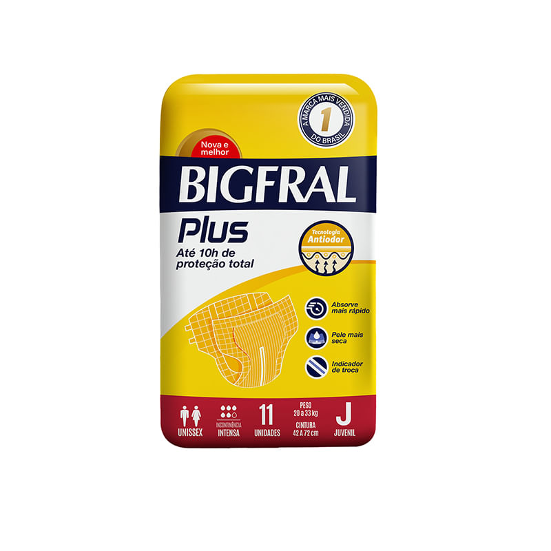 Desenvolvida com toda a tecnologia direcionada ao público com incontinência urinária intensa. O produto está disponível nos tamanhos Juvenil, P, M, G e XG. Garantindo proteção total por até 10h, Bigfral é a marca referência na categoria de incontinência urinária. Produto unissex de uso adulto disponível em dois tamanhos. Com até 10h de proteção total. Com flocos de gel superfiltrantes e superabsorventes que ajudam a distribuir melhor a urina e diminuir o retorno.
