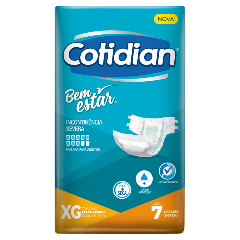 Fralda Bem Estar Cotidian Adulto Unissex XG 7 Unidades A linha de fraldas descartáveis Bem Estar foram desenvolvidas com exclusivo sistema de absorção, garantindo maior segurança, praticidade, conforto e bem-estar. Disponíveis nas versões regular e econômica, são indicadas para os níveis de incontinência leve/moderada a intensa. Possui neutralizador de odores.