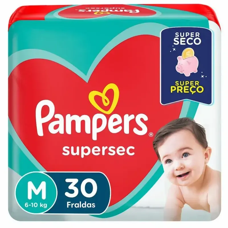 FRALDA DESCARTÁVEL PAMPERS SUPERSEC PACOTÃO M 30 UNIDADESA Fralda Pampers Super Seca Pacotão Médio permite ao bebê até 12 horas de sono com tranquilidade e liberdade de movimentos. Super absorvente, com loção dermacrem, centro ultra fino, barreiras anti vazamento e laterais centopéia flex.Absorve rapidamente o xixi, evitando que ele fique em contato direto com a pele do bebê, evitando possíveis assaduras.