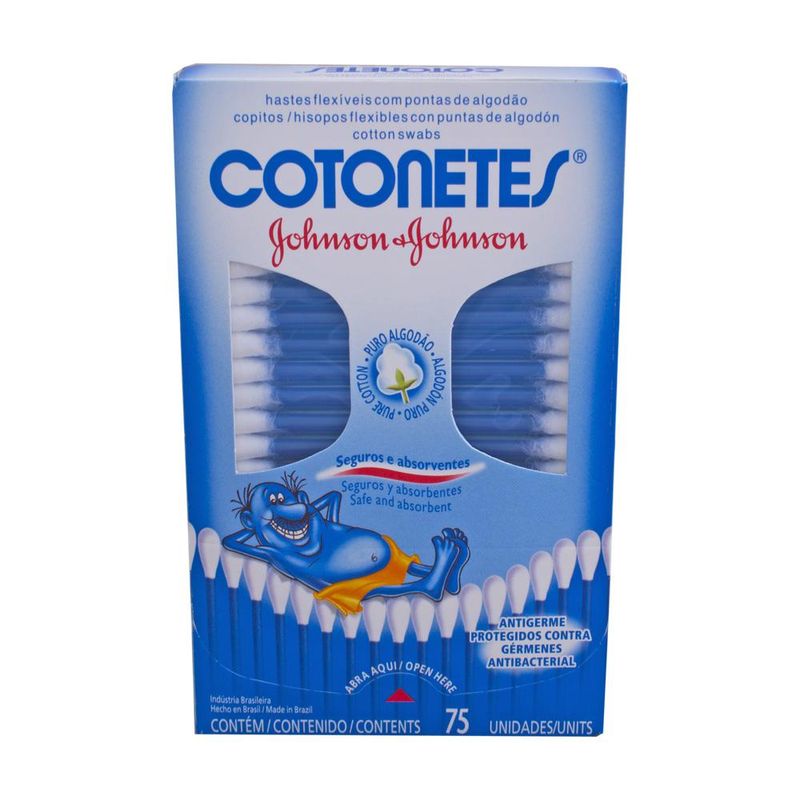 HASTES FLEXÍVEIS COTONETES JOHNSON & JOHNSON 75 UNIDADESCotonetes é feito com algodão 100% puro e possui hastes plásticas flexíveis que prporcionam maior suavidade, conforto e absorção para o cuidado da sua pele.Cotonetes é indicado para a higiene pessoal de toda a família, podendo ser usado para limpar delicadamente a parte externa da orelha (desde que não atinja o canal do ouvido), as dobrinhas do pescoço e pernas do bebê, além de ser recomendado para aplicar e remover maquiagem.USO: Devem ser utilizadas apenas para limpar e secar a parte externa da orelha, nunca introduzidas no ouvido. Seu uso incorreto é responsável por problemas como trauma no canal auditivo, infecções, ruptura do tímpano e perda de audição.
