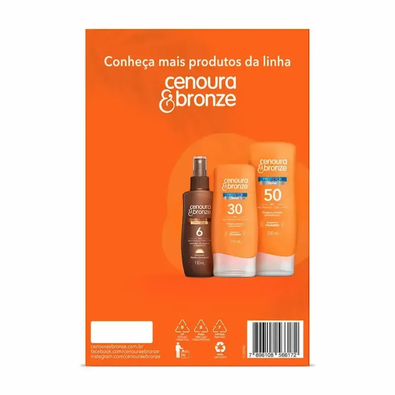 O kit Cenoura & Bronze é um promopack com produtos para proteção solar, composto por um Protetor Solar FPS 30 e um Óleo Spray FPS 6, ambos com 110ml, destinados a proteger e cuidar da pele durante a exposição solar.