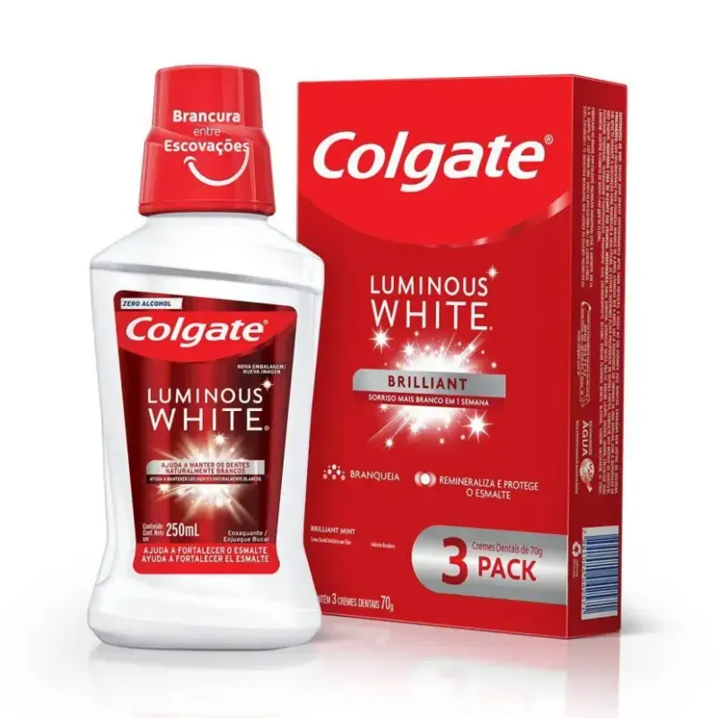 Beleza e Cuidados PessoaisHigiene BucalCreme e Gel DentalKit Colgate Luminous White Brilliant Creme Dental 70g 3 Unidades + Enxaguante Bucal 250ml