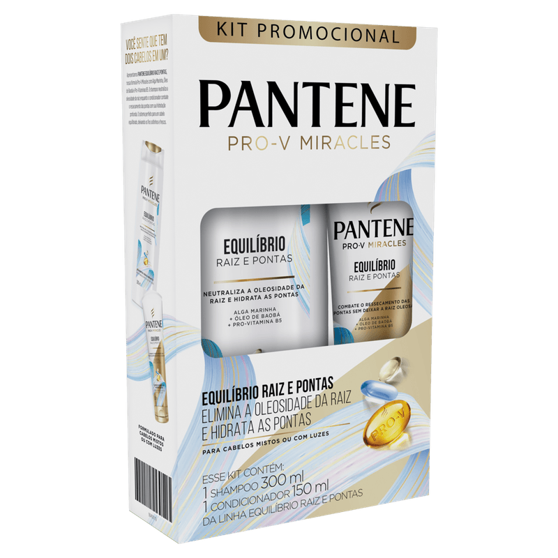 Kit Pantene Shampoo 300ml + Condicionador 150ml Equilíbrio O Kit Pantene é a solução perfeita para quem busca cabelos saudáveis e equilibrados! Com uma combinação poderosa de Shampoo de 300ml e Condicionador de 150ml, este kit foi especialmente formulado para restaurar a vitalidade dos fios. Quais os benefícios?Equilíbrio e hidratação: Fórmula que limpa sem agredir, proporcionando hidratação intensa.Brilho e maciez: Promove cabelos mais brilhantes e sedosos ao toque.Para quais tipos de cabelo?Ideal para todos os tipos de cabelo, especialmente os que precisam de um cuidado extra para manter a saúde e o brilho. Como usar?Aplique o shampoo nos cabelos molhados, massageie suavemente e enxágue.Em seguida, aplique o condicionador, deixe agir por alguns minutos e enxágue novamente.Dicas: Para melhores resultados, utilize regularmente e combine com outros produtos da linha Pantene. Com o Kit Pantene, você transforma seu cuidado capilar em uma experiência de salão em casa!