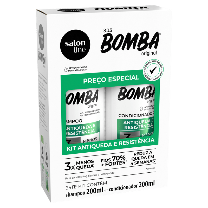 Kit Shampoo + Condicionador Bomba O Shampoo e o Condicionador S.O.S Bomba Antiqueda garantem limpeza, desembaraço e recuperação da saúde dos fios, além de proporcionar 3x menos queda, quebra e pontas duplas dos cabelos. . Principais Ativos Creatina: restaura a fibra capilar, deixando os cabelos mais resistentes. Queratina vegetal: reconstrói os fios, deixando-os fortes e saudáveis. Biotina: ideal para fortalecer as madeixas e combater a queda de cabelo. . Modo de Uso: Shampoo S.O.S Bomba Antiqueda: aplique uniformemente o Shampoo S.O.S Bomba Antiqueda S.O.S Bomba no cabelo molhado. Massageie a raiz até formar espuma. Enxágue. Condicionador S.O.S Bomba Antiqueda: depois de lavar o cabelo com o Shampoo Antiqueda, aplique o Condicionador S.O.S Bomba Antiqueda da raiz às pontas. Deixe agir entre 1 e 3 minutos e enxágue.