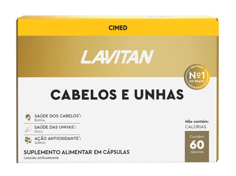 Lavitan Hair Suplemento Alimentar Cabelos e Unhas com 60 cápsulas – CimedMultivitamínico composto por Biotina, Zinco e Selênio. Auxilia na manutenção do cabelo, pele e unhas, possui ação antioxidante que auxilia na proteção dos danos causados pelos radicais livres.O selênio é um antioxidante que auxilia na proteção dos danos causados pelos radicais livres;A biotina contribui para a manutenção do cabelo e da pele;O zinco auxilia no funcionamento do sistema imune;MODO DE USO: Ingerir 1 Cápsula por dia com ajuda de água ou líquido da sua preferência. COMPOSIÇÃO: Lactose, sulfato de zinco heptaidratado, selenato de sódio, cloridrato de piridoxina, picolinato de cromo, D-biotina. Cápsula: (Gelificante: gelatina; Corante dióxido de titânio;ponceau 4R, azorrubina, azul brilhante FCF) Estabilizante: croscarmelose sódica. Antiumectante: dióxido de silício.ALÉRGICOS: CONTÉM DERIVADOS DE LEITE, CONTÉM LACTOSE.NÃO CONTÉM GLÚTEN. SOBRE A LOJA:Somos a rede de farmácias mais antiga de São José dos Pinhais, atuando no ramo farmacêutico desde 1990 com comprometimento à qualidade e satisfação do cliente. É um prazer compartilhar os nossos valores e as nossas conquistas com quem confia no nosso trabalho! Imagens dos Produtos são Meramente Ilustrativas. Todas as Informações Divulgadas são de Responsabilidade Exclusiva do Fabricante/fornecedor.