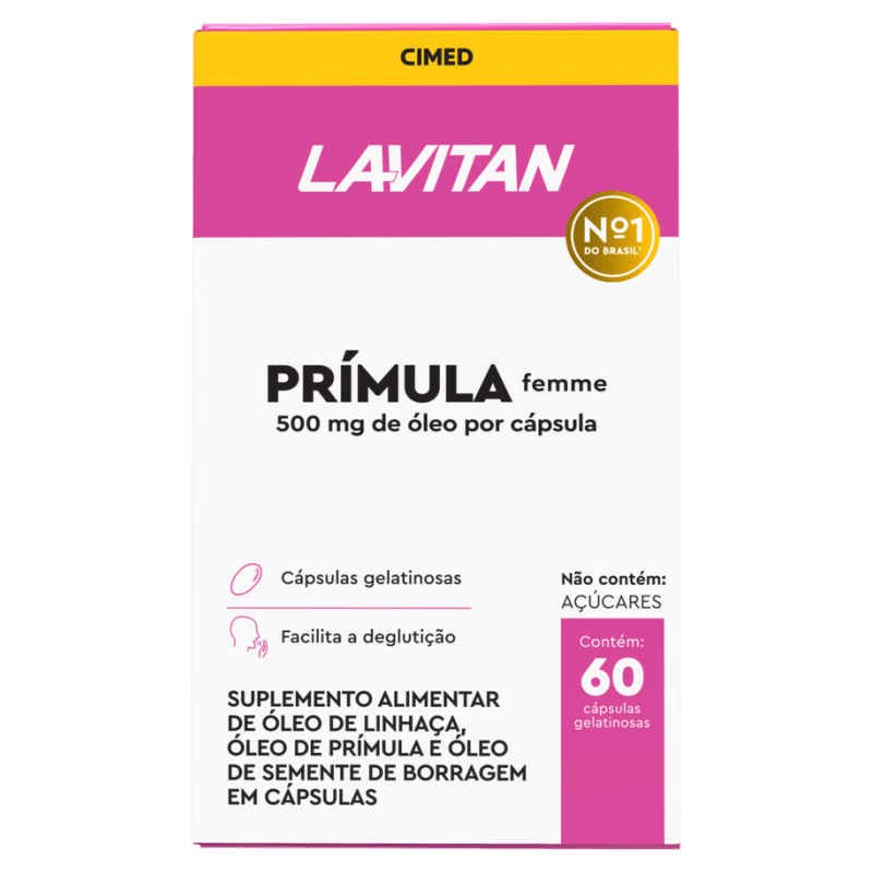 Lavitan Prímula Femme C/60 CápsulaLavitan Prímula Femme é um suplemento alimentar em cápsulas que combina óleo de prímula, óleo de borragem e óleo de linhaça, fontes ricas em ácidos graxos essenciais como o ácido alfa-linolênico. Esses nutrientes são fundamentais para o bom funcionamento do organismo, mas não são produzidos naturalmente pelo corpo, sendo necessário obtê-los por meio da alimentação ou suplementação.Sua fórmula foi especialmente desenvolvida para auxiliar no equilíbrio hormonal feminino, oferecendo suporte durante a TPM e a menopausa. Pode contribuir para o alívio de sintomas como cólicas, inchaço, alterações de humor e ansiedade. Além disso, ajuda a promover a saúde da pele, pode beneficiar o sistema cardiovascular, auxiliar na prevenção do diabetes tipo 2 e amenizar desconfortos relacionados a dermatites.Modo de uso