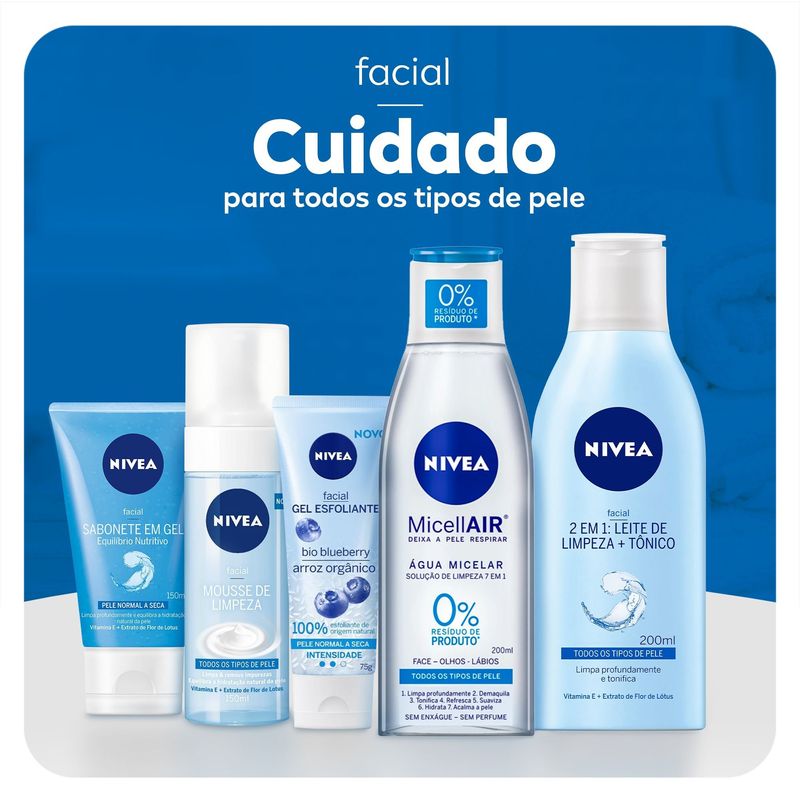 Nivea 2 em 1 é um leite de limpeza + tônico facial que limpa profundamente a pele, removendo impurezas e resíduos de maquiagem e poluição. É enriquecido com Vitamina E (ativo antioxidante que promove uma pele mais saudável e bem cuidada), e Vitamina B5 (ativo que auxilia na renovação da pele). Desobstrui os poros e não deixa sensação oleosa na pele após o uso.