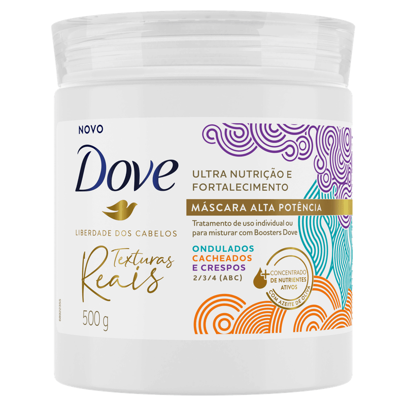 A Máscara de Tratamento Dove Texturas Reais é de alta potência e promove ultra desembaraço, nutrição e fortalecimento e deve ser usada para a hidratação dos cabelos ondulados, cacheados e crespos tipo 2/3/4 (A B C).