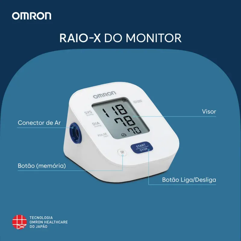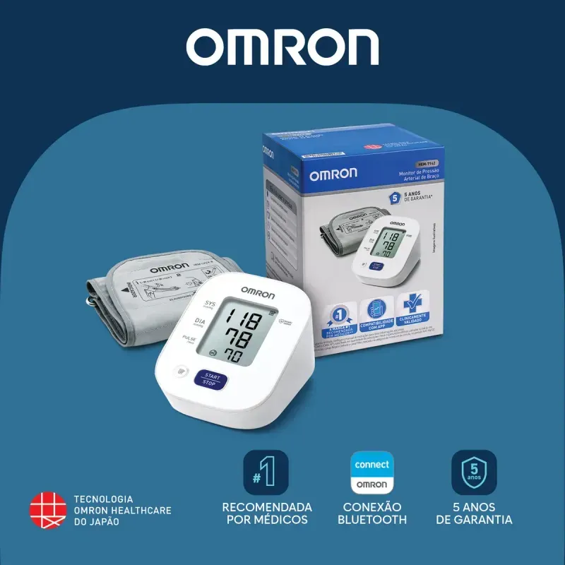 O que é e para que serve o Monitor de Pressão Arteria de Braço Omron HEM-7142-BR?Monitor de Pressão Arteria de Braço Omron HEM-7142-BR é o único dispositivo 2 em 1 do mercado que permite aferir a pressão arterial e realizar um eletrocardiograma simultaneamente. Com tecnologia avançada e validação clínica, ele detecta condições como fibrilação atrial, bradicardia, taquicardia e ritmo sinusal normal. Ideal para uso doméstico, oferece praticidade, precisão e conectividade com o aplicativo Omron Connect para acompanhamento remoto da saúde cardiovascular.