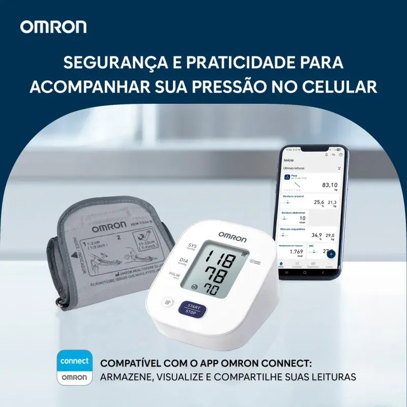 Como usar o Monitor de Pressão Arteria de Braço Omron HEM-7142-BR?Instale as pilhas e emparelhe o dispositivo com o aplicativo Omron Connect. Coloque a braçadeira no braço conforme indicado, sente-se corretamente e siga as instruções para realizar a medição da pressão arterial e/ou o registro do ECG. Os resultados serão exibidos no visor e sincronizados com o aplicativo.
