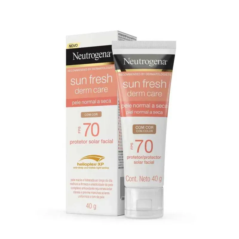 NEUTROGENA SUN FRESH® Derm Care Dry Skin Facial FPS 70 possui textura levinha e hidratante que não derrete. A exclusiva tecnologia HELIOPLEX® XP oferece muito alta proteção ampla e eficaz contra os raios UVA, UVB e ajuda a proteger contra a luz visível. Com ativos ricos em propriedades hidratantes que deixam a pele macia, aveludada e preenchida. Complexo antioxidante rejuvenescedor formado por Niacinamida, ativo clareador de sinais causados pelo sol, Feverfew e Vitamina C, poderosos antioxidantes. Melhora a firmeza e elasticidade da pele e possui textura não oleosa. Dermatologicamente testado. Adequado para a pele sensível.