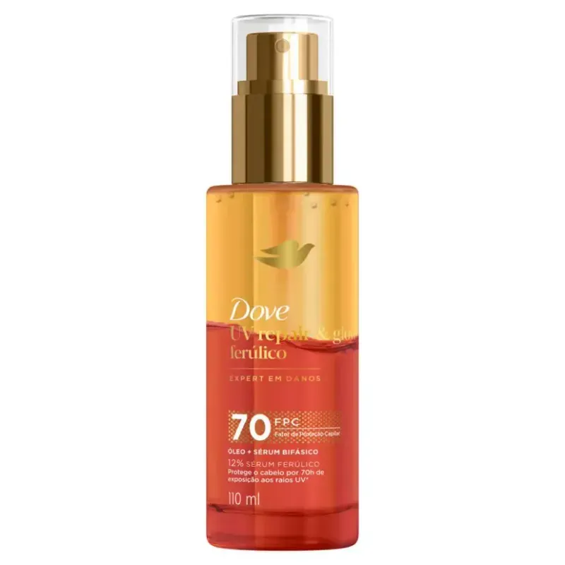 O Óleo + Sérum Bifásico Dove UV Repair & Glow + Ferúlico é um tratamento capilar desenvolvido para reverter os danos causados pelos raios UV e proteger os cabelos da exposição solar por até 70 horas.
