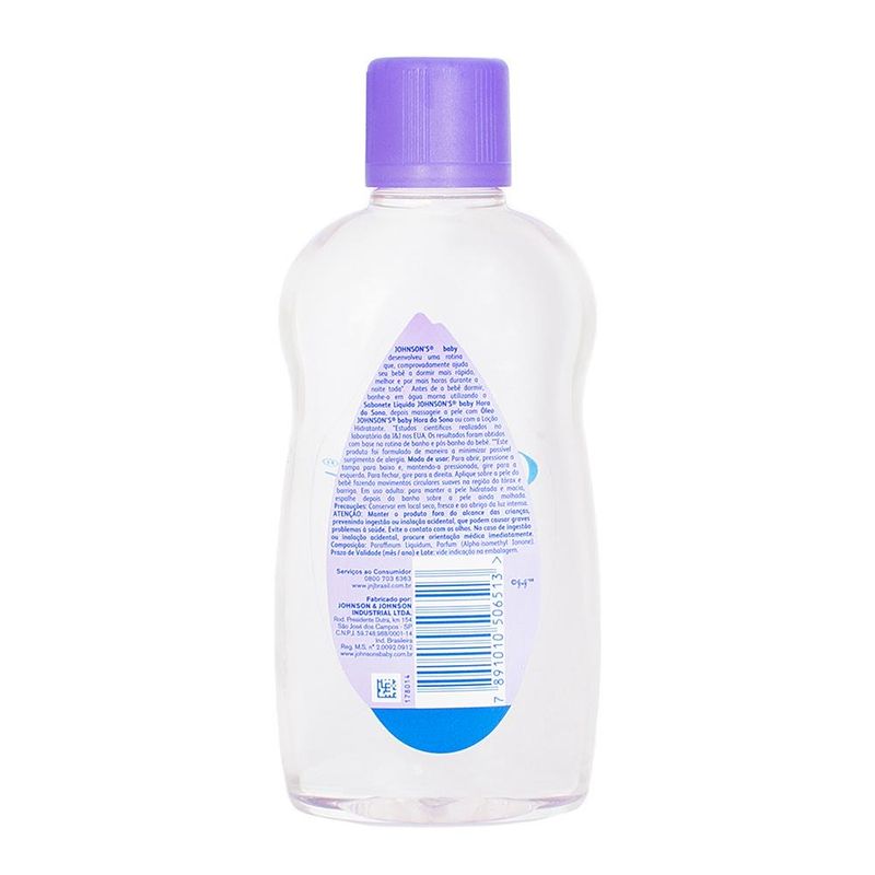 Óleo infantil johnsons baby hora do sono 200mlO Óleo Infantil Johnson’s Baby Hora do Sono é formulado especialmente para ajudar a criar uma rotina de sono relaxante para o seu bebê. Com uma combinação suave de ingredientes, este óleo é ideal para massagear e acalmar o bebê antes de dormir, promovendo uma sensação de tranquilidade e bem-estar.Desenvolvido para ser delicado com a pele sensível do bebê, o óleo é hipoalergênico e livre de parabenos, corantes e sulfatos. Contém uma mistura especial de óleos naturais, incluindo óleos de amêndoas e camomila, que ajudam a nutrir e hidratar a pele do bebê. Enriquecido com uma fragrância suave que contribui para um ambiente de sono mais tranquilo, ajudando a acalmar o bebê e preparar para a hora de dormir. Sua textura leve e não oleosa do óleo facilita a aplicação e a absorção, garantindo uma massagem confortável sem deixar a pele pegajosa.Ajuda a manter a pele do bebê macia e hidratada, prevenindo o ressecamento. Com fragrância e a aplicação do óleo contribuem para um momento relaxante, ajudando a preparar o bebê para um sono tranquilo. Ideal para ser incorporado na rotina noturna, promovendo um ritual de cuidado que favorece o relaxamento antes de dormir.Modo de Uso:- Coloque uma pequena quantidade do óleo nas mãos e esfregue para aquecê-lo.